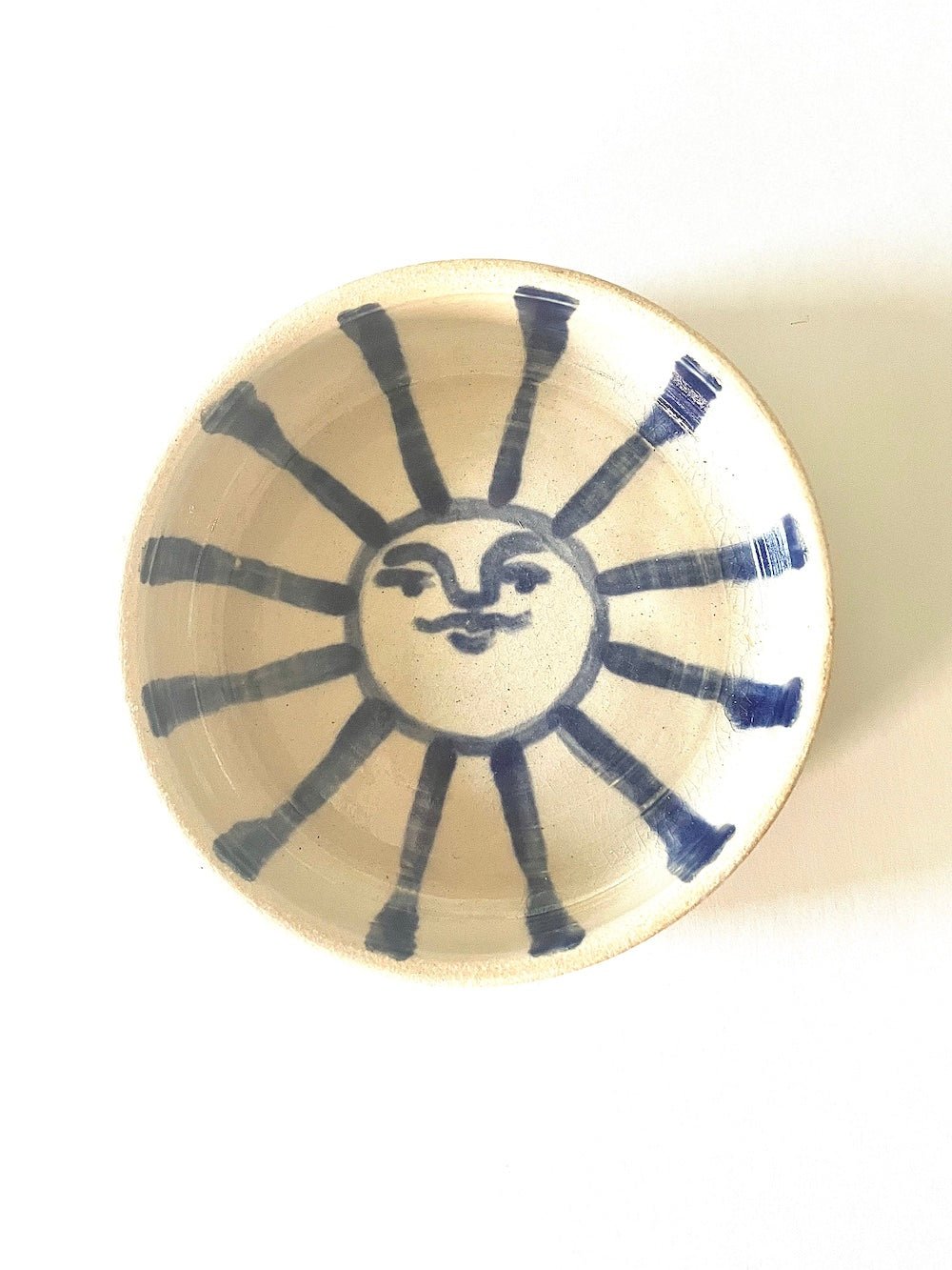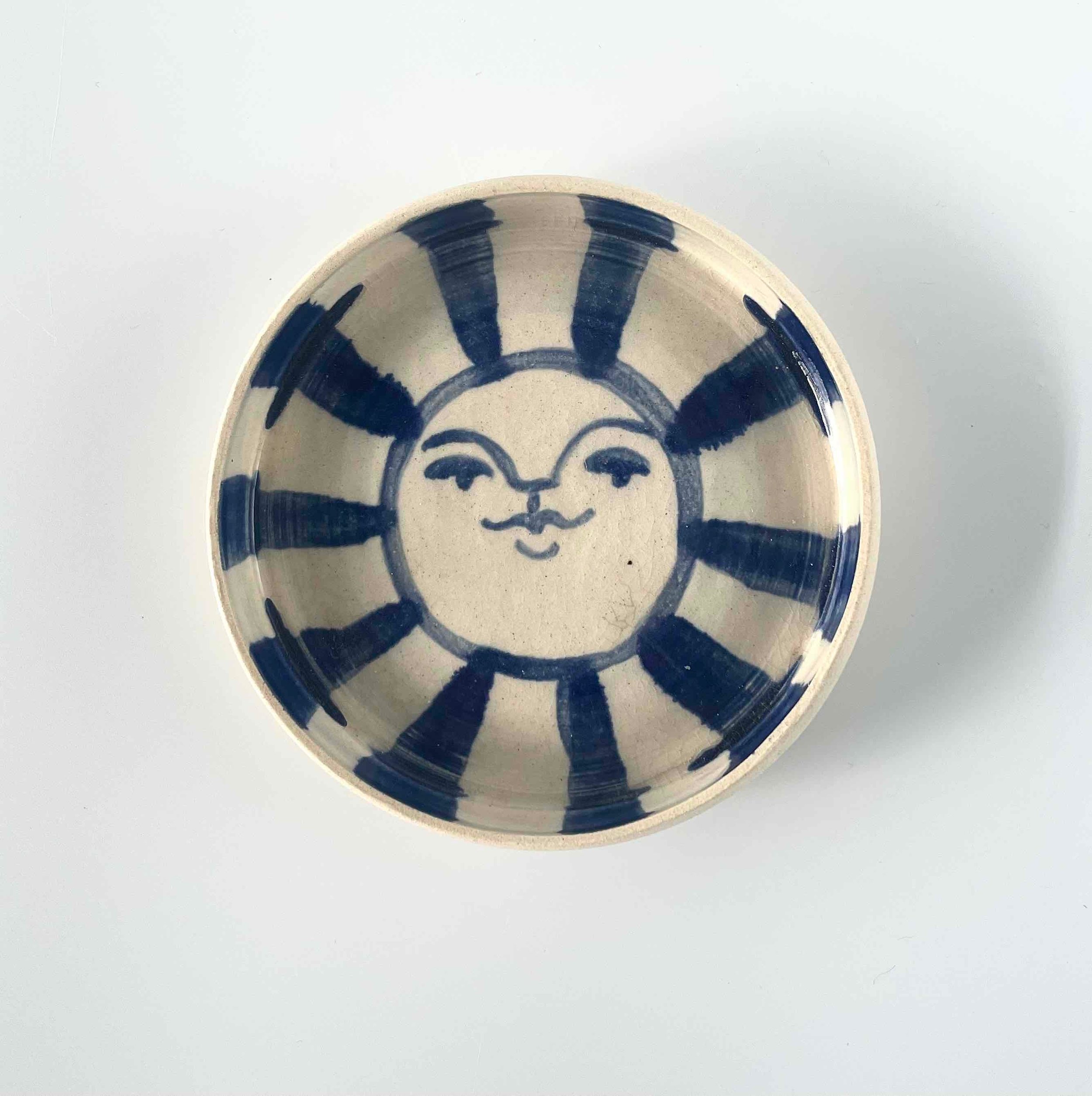 Each catch-all is hand-painted, so each sun's face is unique. Glazed with high gloss clear over bright blue. The outside of the catch-all is not glazed. Approximately 4.5" in diameter.